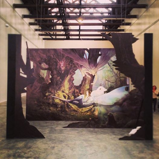 In a Landscape ( Digital print on Wood 2014) is a collaboration project between artist and stage director Martin Butler and digital painter Floris Didden. Inspired by early 19th century theatre design, Floris created a three dimensional digital painting allowing you to enter into a fairy realm. Using the classical stage principles of Trompe-l’œil, and forced perspective, the viewer is able to peer into and enter this representation of a world between worlds. The piece was originally commissioned for the Mediamatic lightness exhibition ” Fays, Fairies and Other Magical Creatures”.