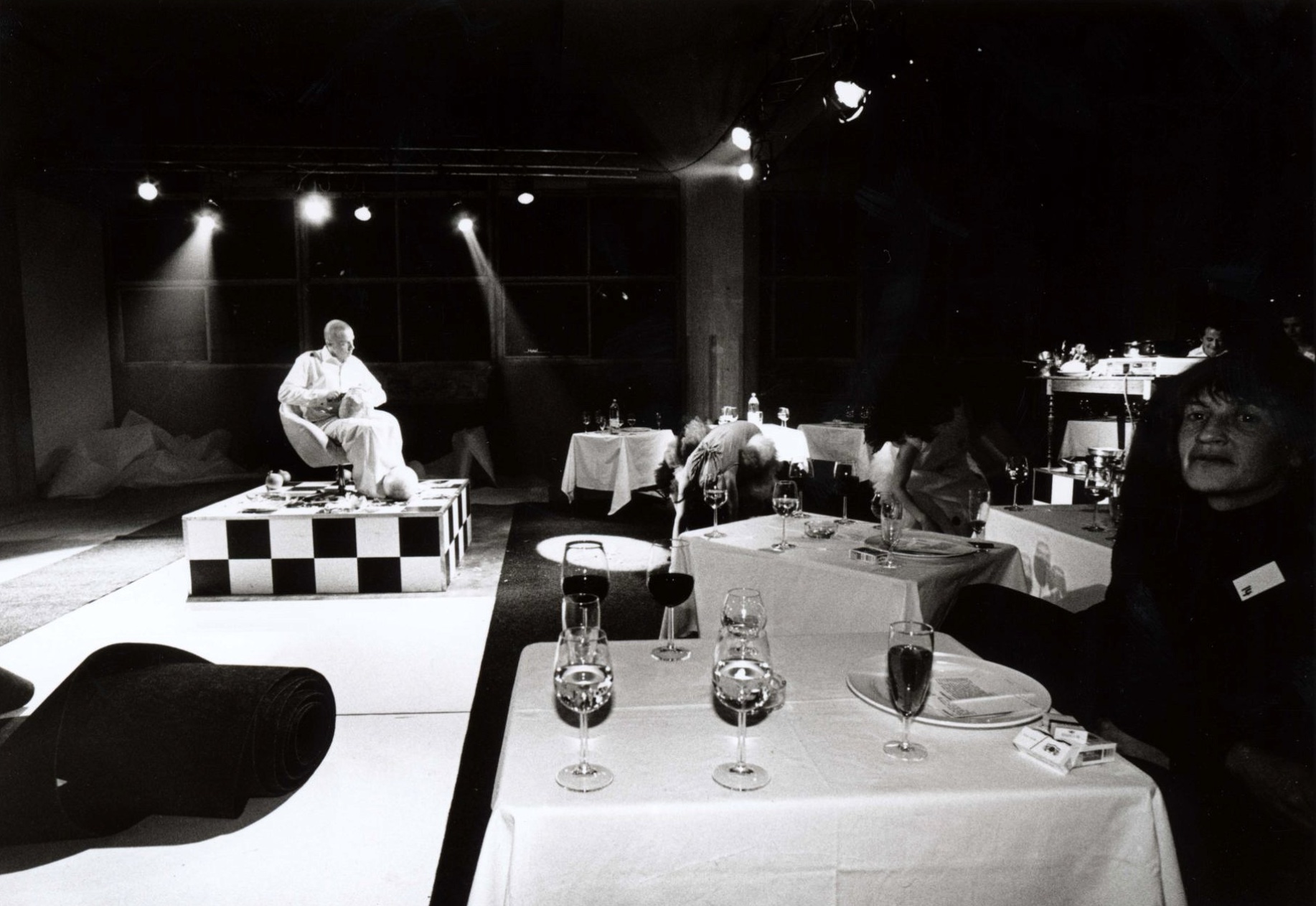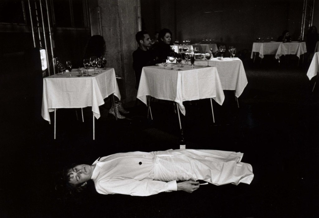 Prior to the event, a cook had spent three days preparing a classical seven course french dinner for a group of invited musicians, video artists, performers, fashion and graphic designers.
