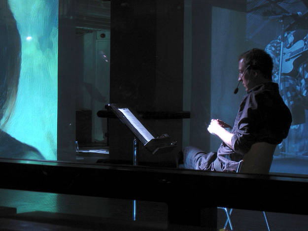 The performers were surrounded by video screens, as that part of the text was read, and the key work mentioned, random images tagged with that word were projected live from the flickr site. Creating a sometimes banal or thought provoking contemporary photo landscape constructed from random amateur images.