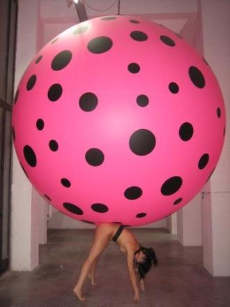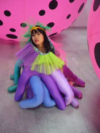Under the flag of “Fashion, Art, Activism” Paris based collective, Andrea Crews, creates events on the forefront of fashion and art. The Crews footprint is made with a frontier guerilla spirit and a wide-eyed precociousness; a childlike audacity conducted by an astute maestro. Crew’s December 14th event was something like a coup d’art. In the newly opened contemporary art centre WIELS, in Brussels, a body of work from Japanese artist Yayoi Kusama’s dots obsession series bubbled and boiled. Giant pink inflatable sculptures covered in black polka-dots were suspended in the air and plopped on the floor, captured in bouncing motion. The installation continued further inward where an opening in an inflatable gave way to an interior space overrun by the polka-dot epidemic. Hanging from a ceiling overtaken by the dots, round paper lanterns covered in black polka dots bounced light on the walls and floor where the rash obsessively continued. Here Yayoi Kusama invited the viewer into the actual hallucinations she had as a child and we can recognise her feverish fear of this force that is all consuming, all devouring; for her the dots are aggressive and they take no prisoners. Here in WIELS, Kusama’s body of work took the viewer into a feverish body; here in WIELS, Crews was the fever; running rampant and hysterical; beautiful and fantastic.