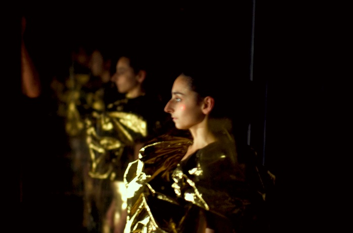 Martin Butler expresses his fascination for lovers‘ tendency to develop the same habits, make the same gestures, have the same way of dressing and talking. Mirrorwise. On stage a number of framed transparent screens on wheels are, of course, functioning as mirrors. The dancers Mariangela Tinelli and Gaia Gonnelli are dressed in shiny, skin-tight costumes. While one of them studies herself in the mirror, coquettish and vain, the other places more mirrors around her. Tinelli starts to move slowly, intensely watching her reflected image, opening a series of scenes marked by chapter numbers until the see-through mirrors are arranged in a line. They move towards the glass wall and study each other, moving synchronically as if they were looking at their own image in the mirror. The real and the double.
