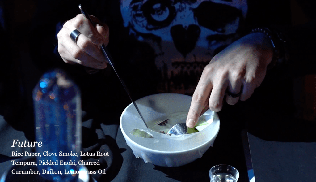 Each of the eight courses was created using spoken word, taste, scent, and sound, taking the guests through eight “real” autobiographical stories of conflict, famine, past loves, lost parents, future dystopias, and memories of childhood.