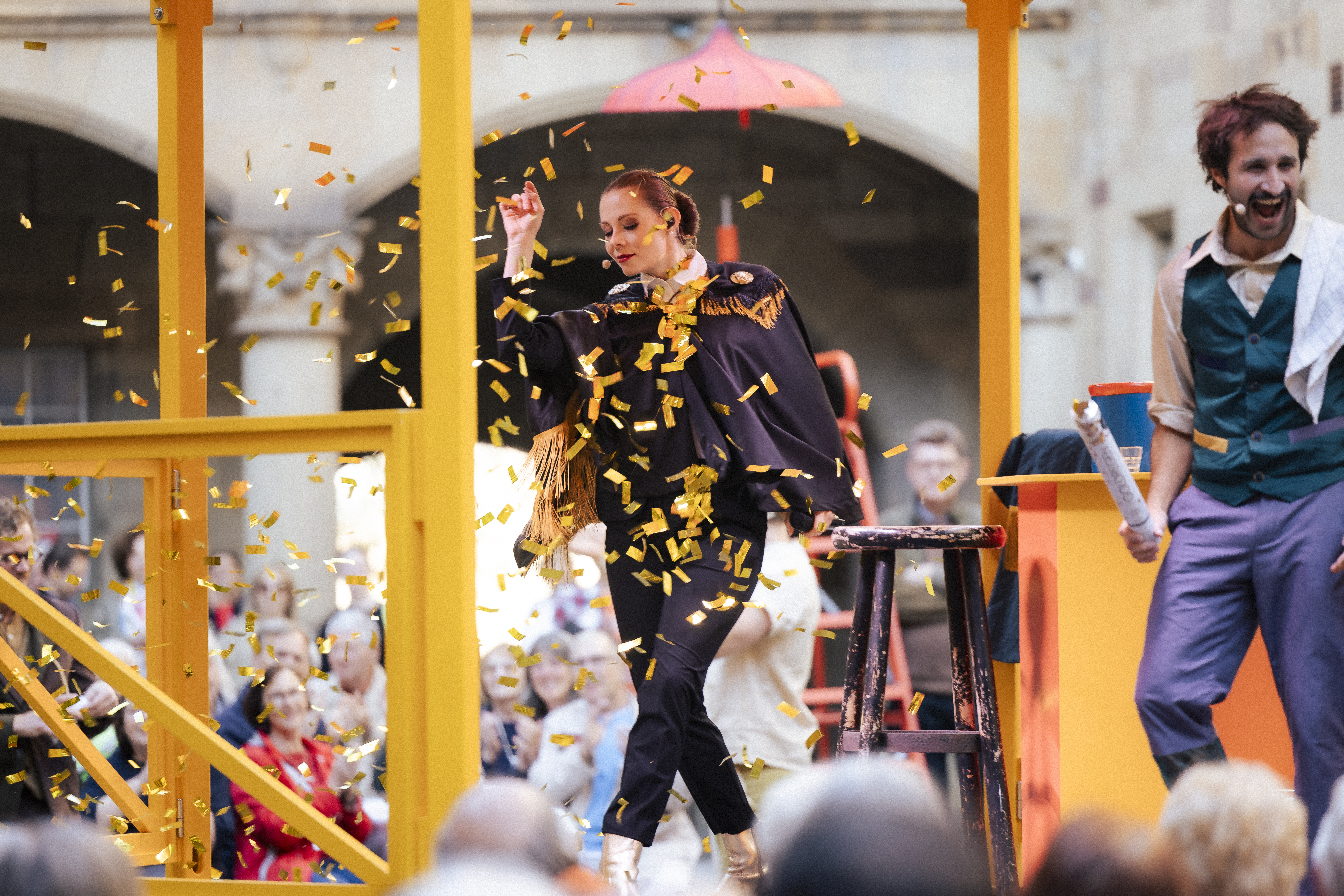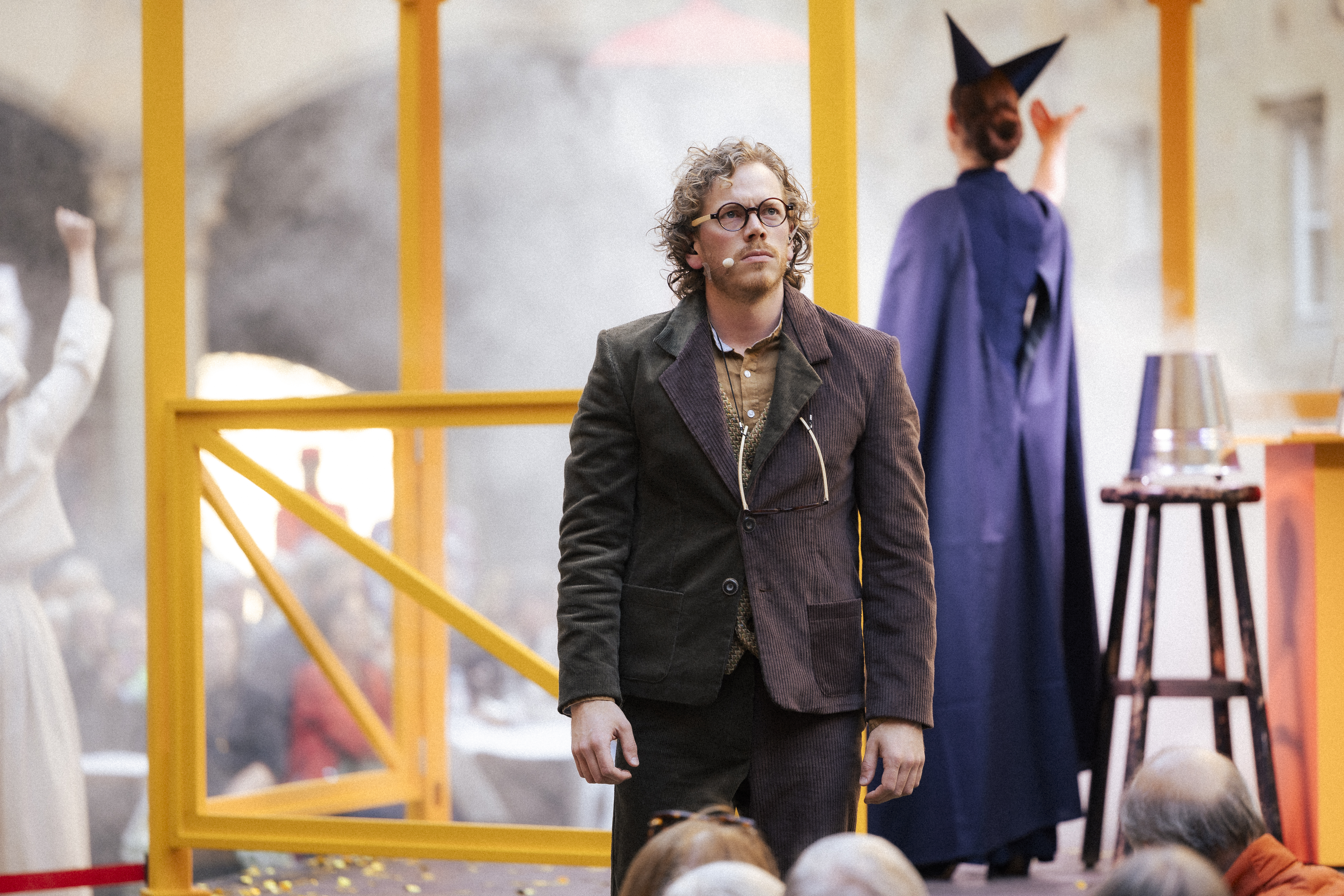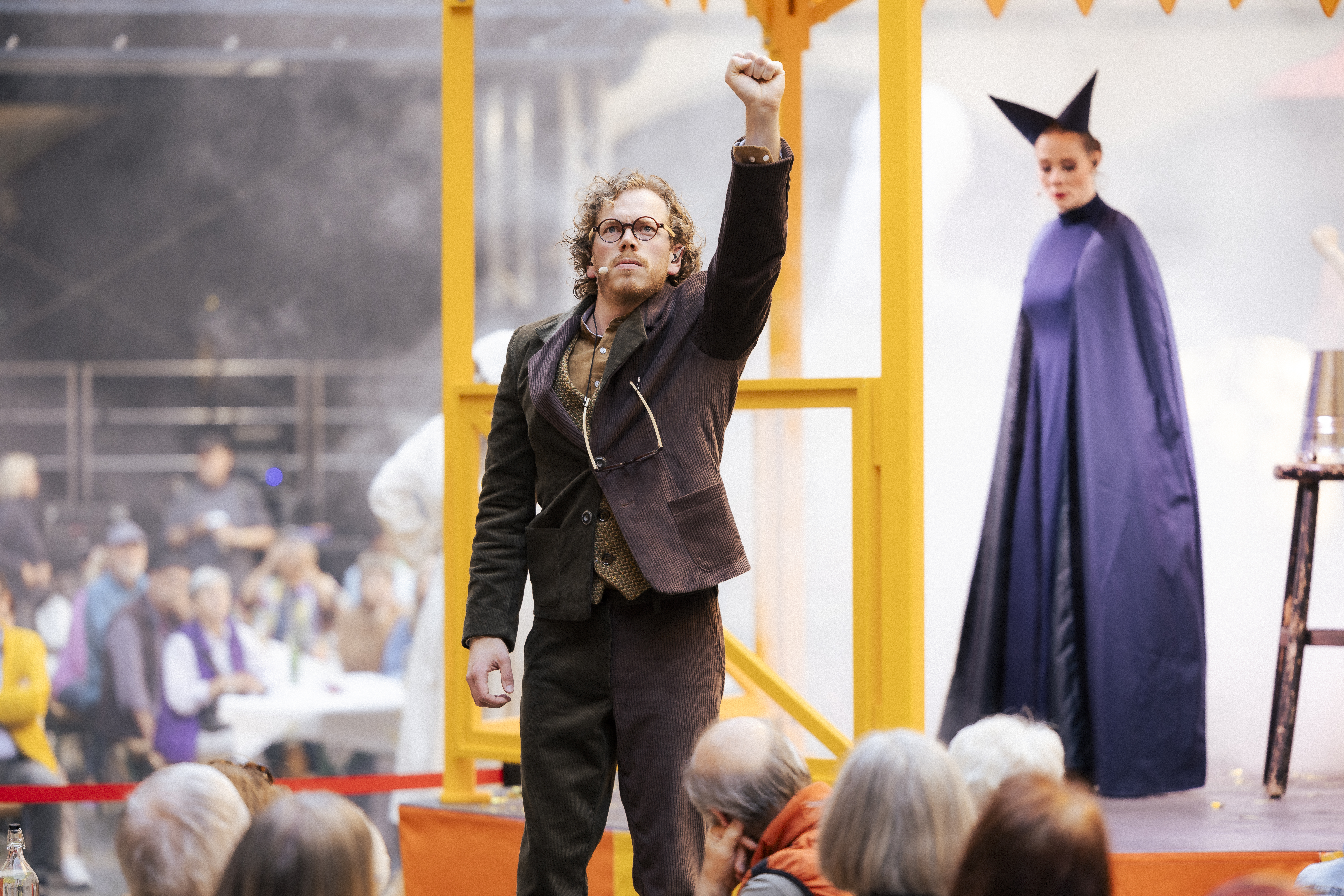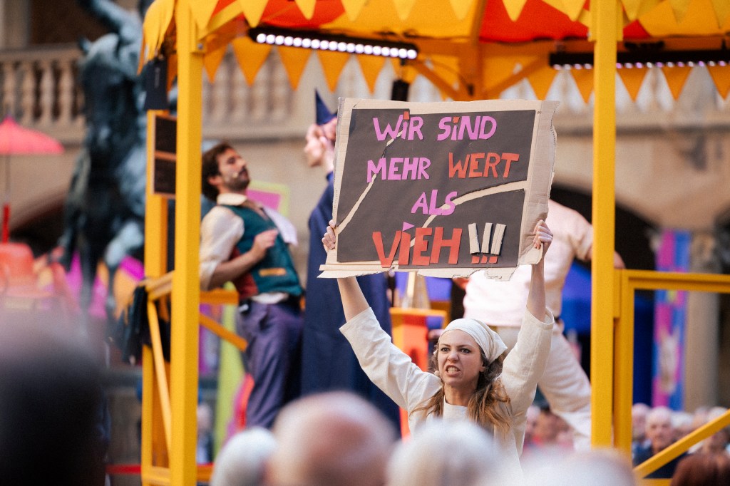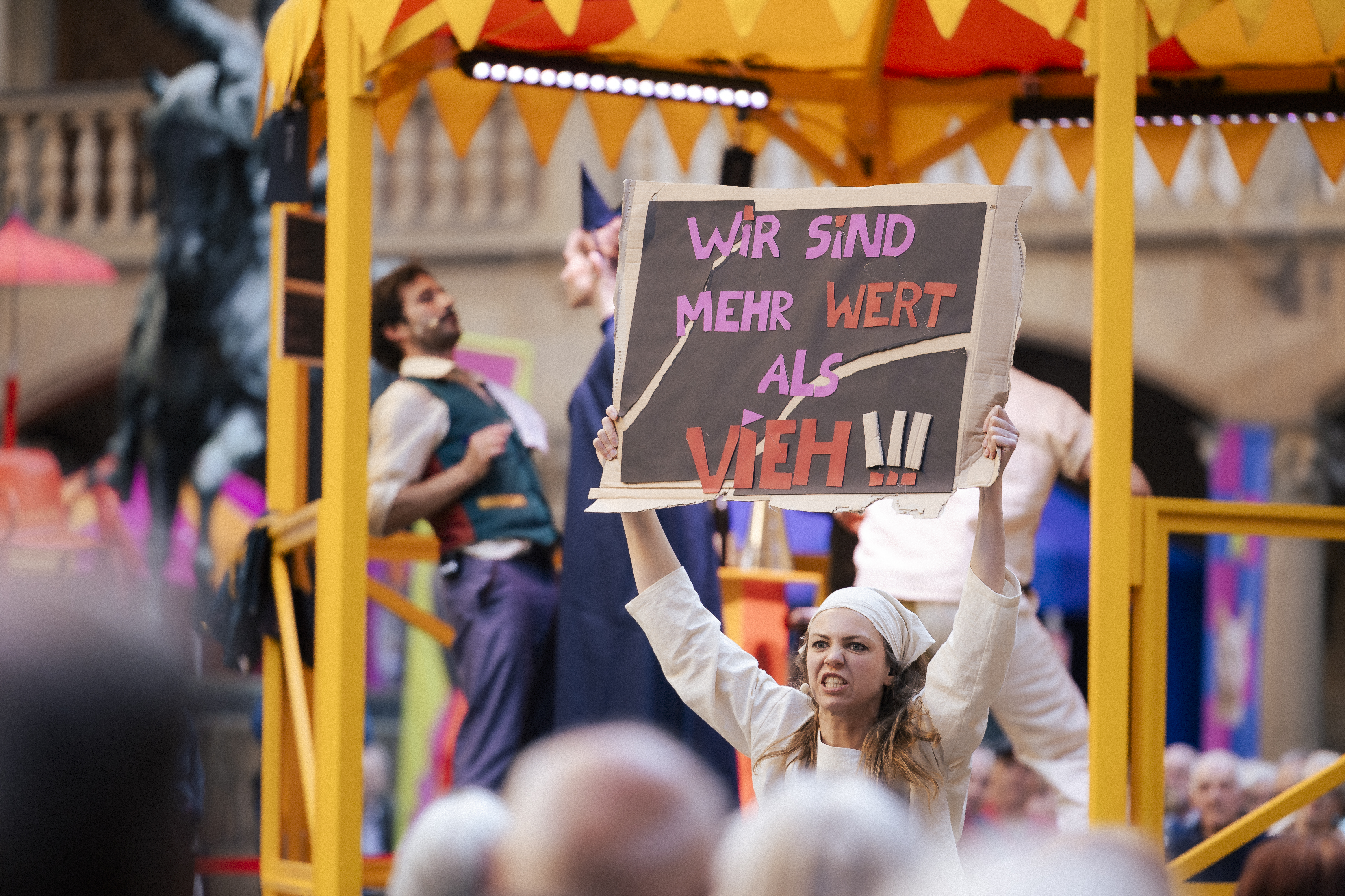 Set against this backdrop, a play tells the story of the Peasants’ War and the motives of the people of that time. The Fool acts as master of ceremonies and tour guide. In an emotional journey through time with gripping texts and rousing songs, the audience is transported into the unjust world of the 16th century – experiencing firsthand the tensions and horrors of the Peasants’ War, but also the hope and enthusiasm of the resistance.